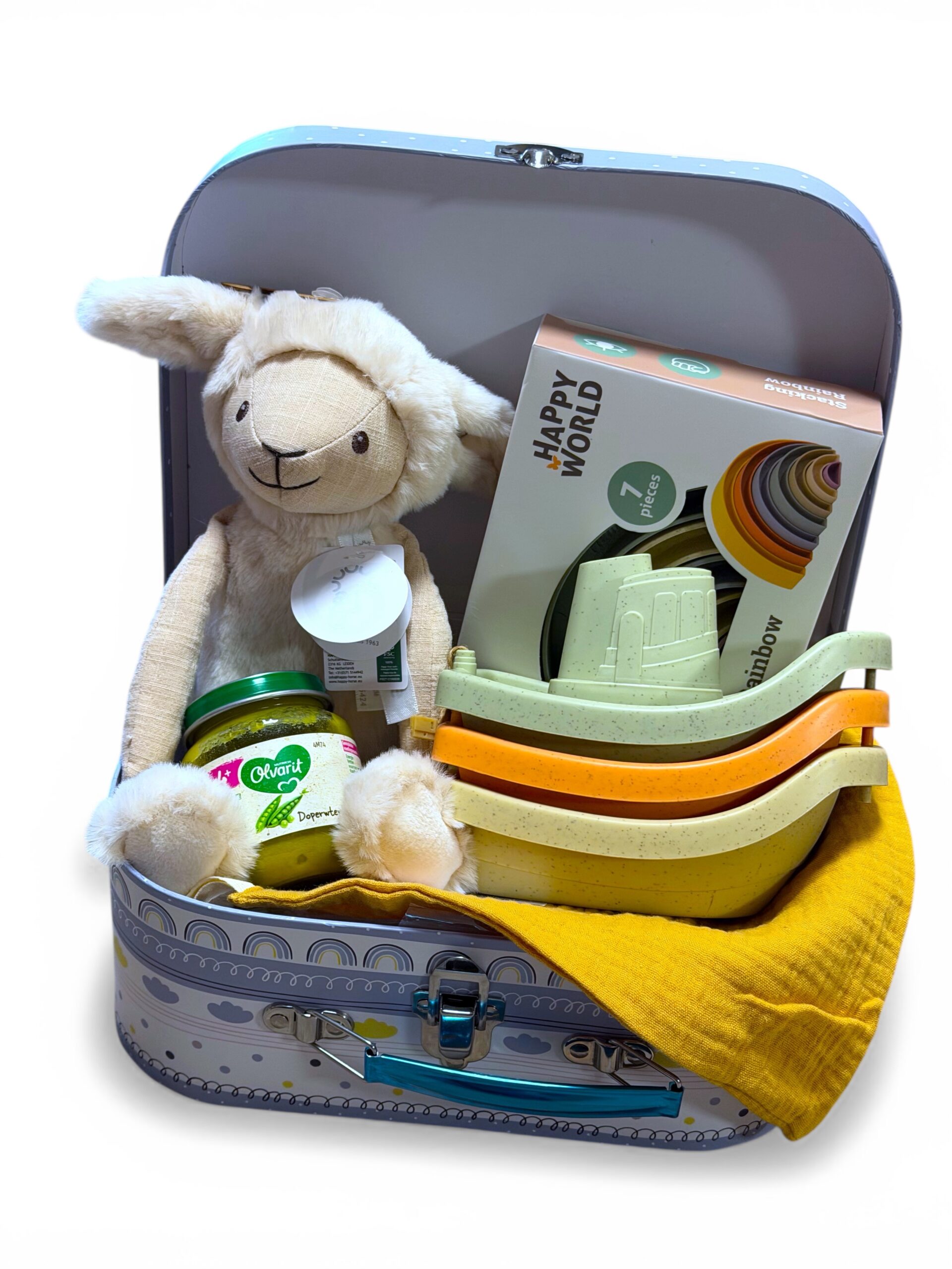 De koffer bevat een combinatie van knuffel, duurzaam speelgoed en praktische items voor de eerste maanden. Het zachte lammetje van het bekende merk Happy Horse wordt al snel een favoriet knuffelvriendje, terwijl het kleurrijke speelgoed uitnodigt tot ontdekken en spelen.